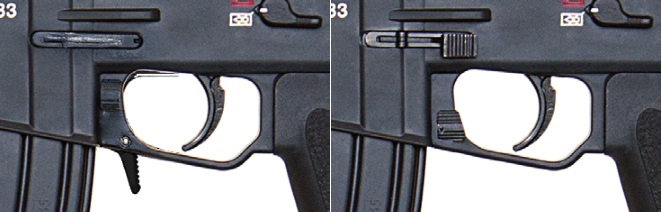 チャージングハンドルは射撃時に連動せず、左右どちらかに付け替え可能なG3に似たチャージングハンドルとなった(ただし根元のラックはないためHKスラップは使用できない)。